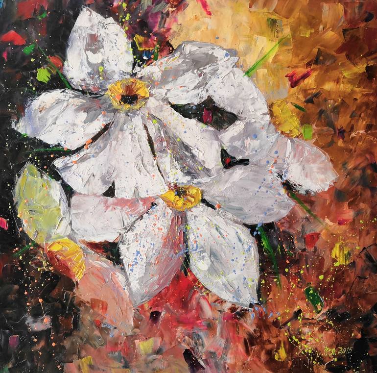 Painting "Narcissus", 2015, oil, canvas on a stretcher 19.7x19.7 inches. Interior, bright, greasy smear written by palette knife. This picture is suitable for almost any interior. The artwork has texture, you can feel the strokes by touching the painting. Stretched on a wood stretcher, edges painte...