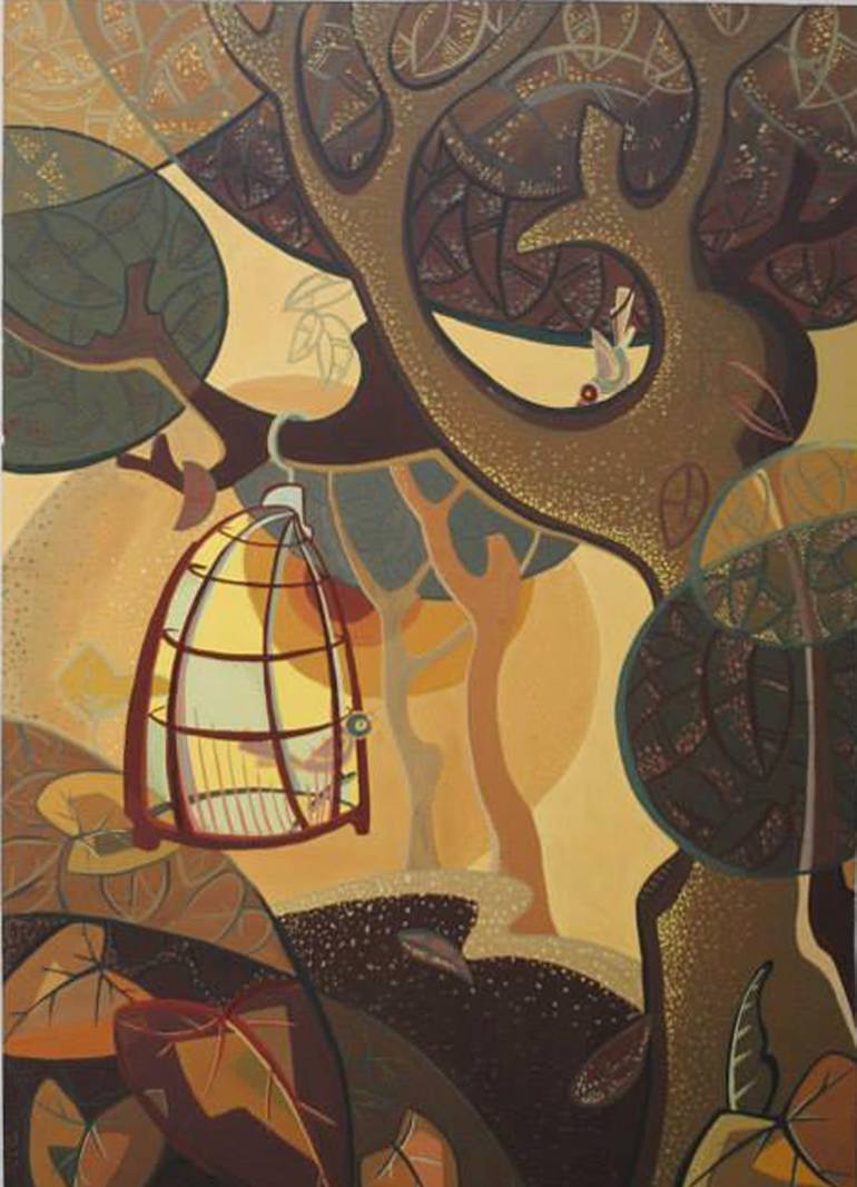 Welcome to the remarkable artwork "Nature Scenery". The painting depicts a peaceful scene where the beauty of trees and life blend together in a unique home. The image of trees dominates, creating a familiar yet novel space. The birdcage suspended under the canopy evokes feelings of freedom and limi...