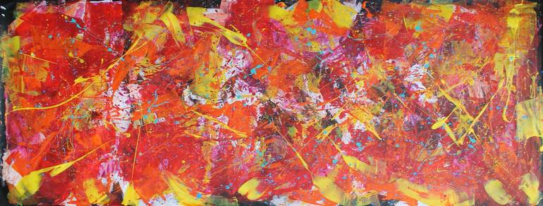 This oversized painting is a vibrant and energetic work of art that draws the viewer's attention. The background of the painting is a mix of yellow and orange, creating a warm and cheerful effect. The circular shapes, painted in bright yellow and orange colors, are arranged in a dynamic pattern that...