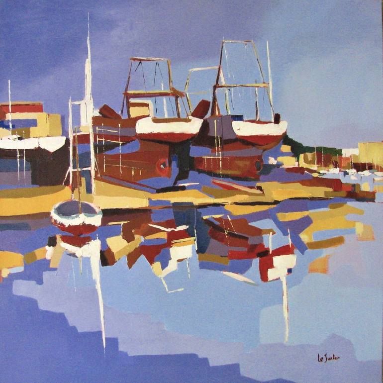 This original oil painting, "Naval Shipyard", depicts trawlers under repair at the Spano shipyard in Grau du Roi, a beautiful Mediterranean harbor in the south of France. The artist masterfully captures the vibrant color contrasts and the mesmerizing reflections of the boats in the calm water. Paint...