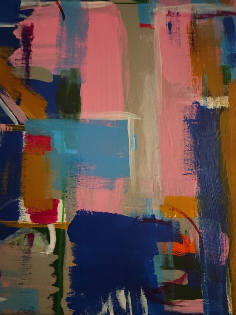 My love of geometric shapes and lines dominate the piece. Navy blue, gray and pink compliment each other and any room decor.