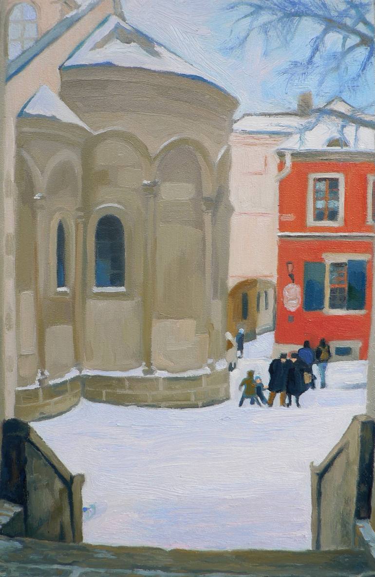 This is the yard near the Armenian Church. People are passing through the yard. Children are playing in the snow. A cheerful winter mood.