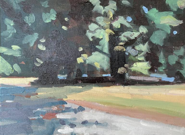 Inspired by a walk into Skinner's Butte Park in Eugene (OR). Hoping that the viewers appreciate how the flat dark areas interact with the machine or dabs of lighter, brighter brushstrokes. This is a true oil painting with the pigments interacting in various ways wet into wet.