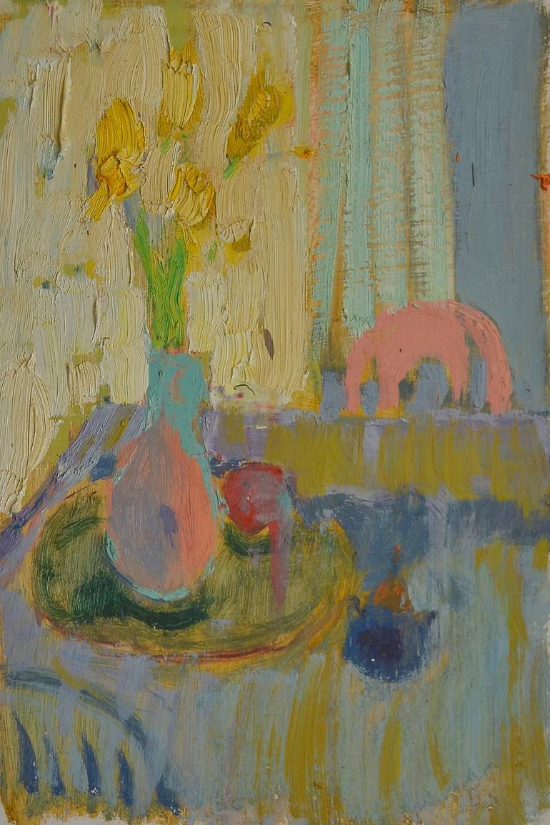 Bright yellow flowers in a tall vase dominate the scene, bringing life to the rustic setting. Soft, pastel hues of blue, pink, and green create a calming, almost dreamlike atmosphere.
