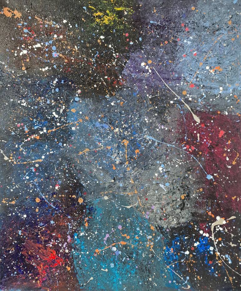 Fantastic and peculiar modern painting made on high quality cotton canvas, with enamels and acrylic materials. It is an expression in the shape of a space galaxy with various shades of blue, fuchsia, gold and other tones sprinkled using the Dripping technique, similar to the Jackson Pollock style, ...