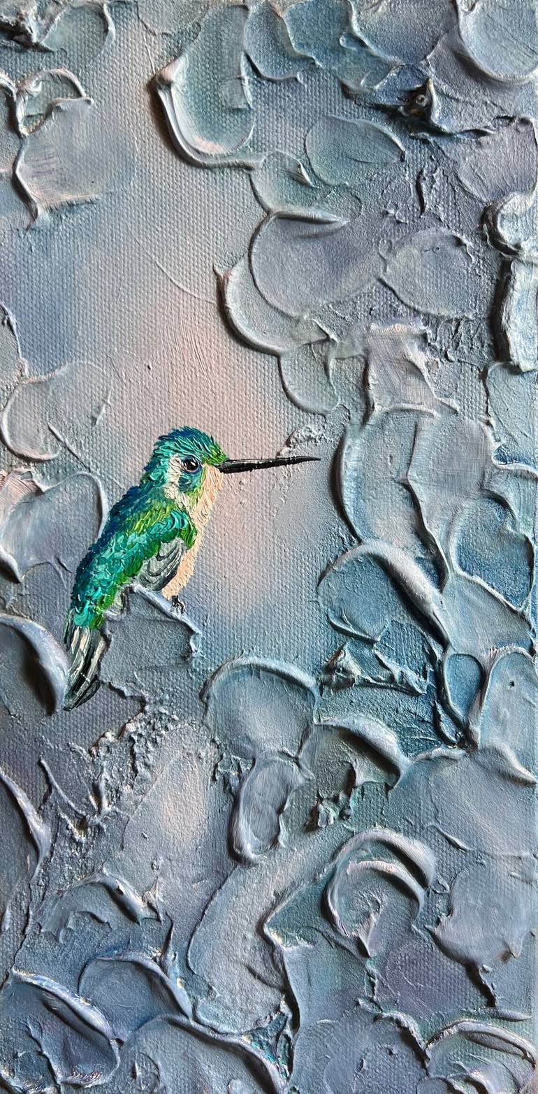 Hummingbirds buzz around me as I paint on my Santa Monica, California balcony. They are a constant source of joy and inspiration. This piece has many layers of molding paste and paint building up tactile texture and a magical atmosphere. Nebulous Perch's background technique is influenced by my Oc...