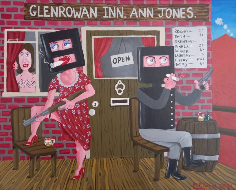 Another Ned Kelly painting. Obviously originally inspired by, Sid Nolan. In this painting I have depicted Ned Kelly and Steve Hart outside the Glenrowan Inn( the scene of their final showdown )enjoying a smoke and a lovely drink of, grog. Steve is looking through the window at Ann Jones, who's dress...