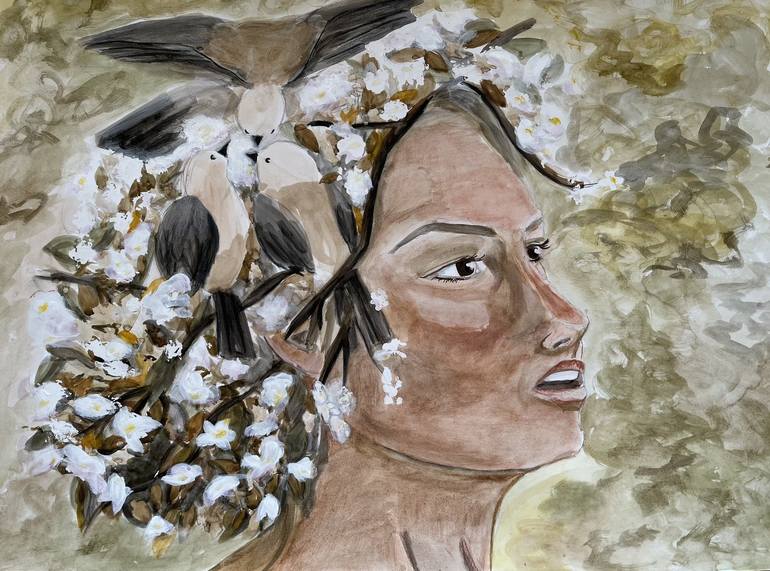 This mixed media painting was inspired by an unsettling dream that awakened me in the night. This image depicts a theme from the collective unconscious. So many of us need to get out of our heads, allow our suppressed desires to blossom into good fruit, and our dreams to fly off and become our rea...