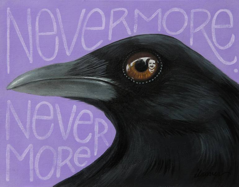 2023 / Acrylic and graphite on canvas panel. New contemporary painting of a raven with Edgar Allan Poe's refection on the birds eye. The background shows the words "nevermore, nevermore".