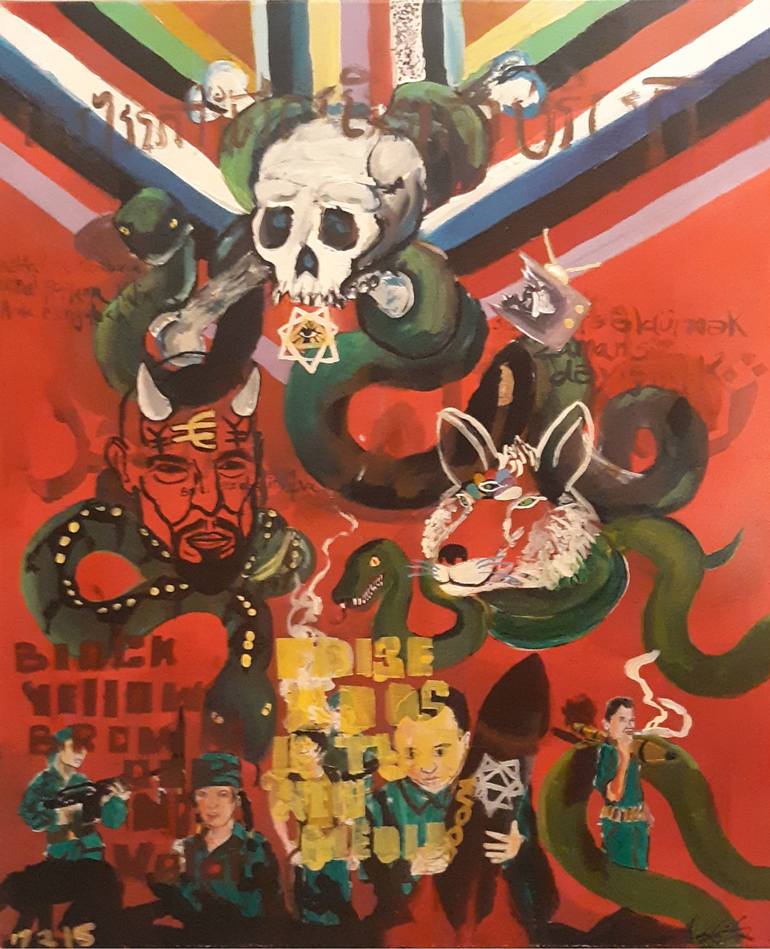 a street art on canvas showing how media moves armies of every kind across everything.... It either builds or destroys
