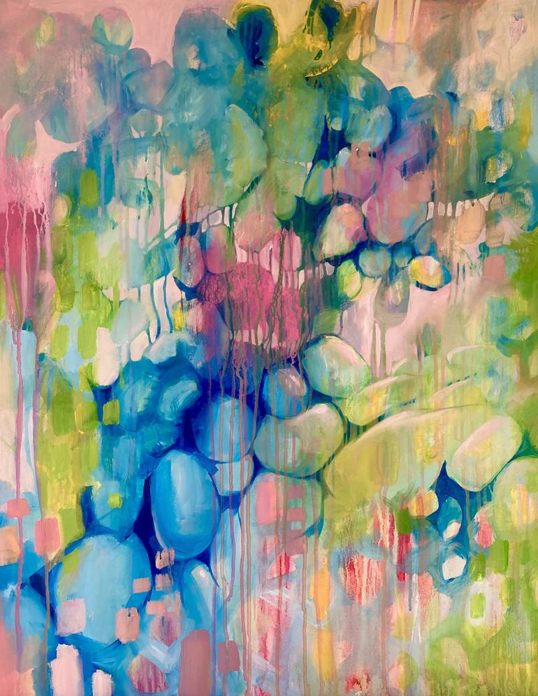Abstract paintings in vibrant blue, green, magenta, yellow and pink. Vibrant painting, art gift, original contemporary art. Any space would look uplifted by this piece inspired by Nature. The vivid colour palette and patterns will lighten up and bring great vibes to any room that it hangs in. High-...