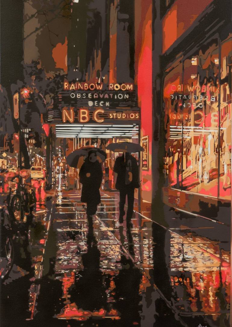 "New York in the Rain," a spray on canvas, captures a nighttime scene in the vibrant city of New York, illuminated by the red and white lights of the NBC Studios signs. At the center of the composition, a couple under umbrellas stands silhouetted against the lively urban backdrop, creating an effect...