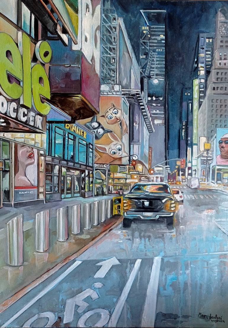 In my painting, I wanted to capture the vibrant energy and intensity of a city that never sleeps. Using acrylics and oils, I depicted the bright lights of billboards and the frenetic movement of vehicles on a New York street. The work combines realism and pop art, reflecting the fusion of everyday l...