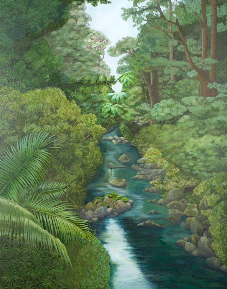 Nature has always inspired my work and I consider myself blessed to live in New Zealand where I am surrounded by lush bush and where there are always hidden treasures. This scene is an intimate setting with a stream winding through thick bush. My natural environment is a place where we I can clear...