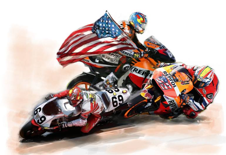 Champion Drive, celebrates one of motorcycle racing's most electrifying champions, Nicky Hayden. Original art-piece is a sage, watercolor, acrylic and ink piece rendered to 190lb., watercolor stock, matted and framed, approximately 28x23”x2.”