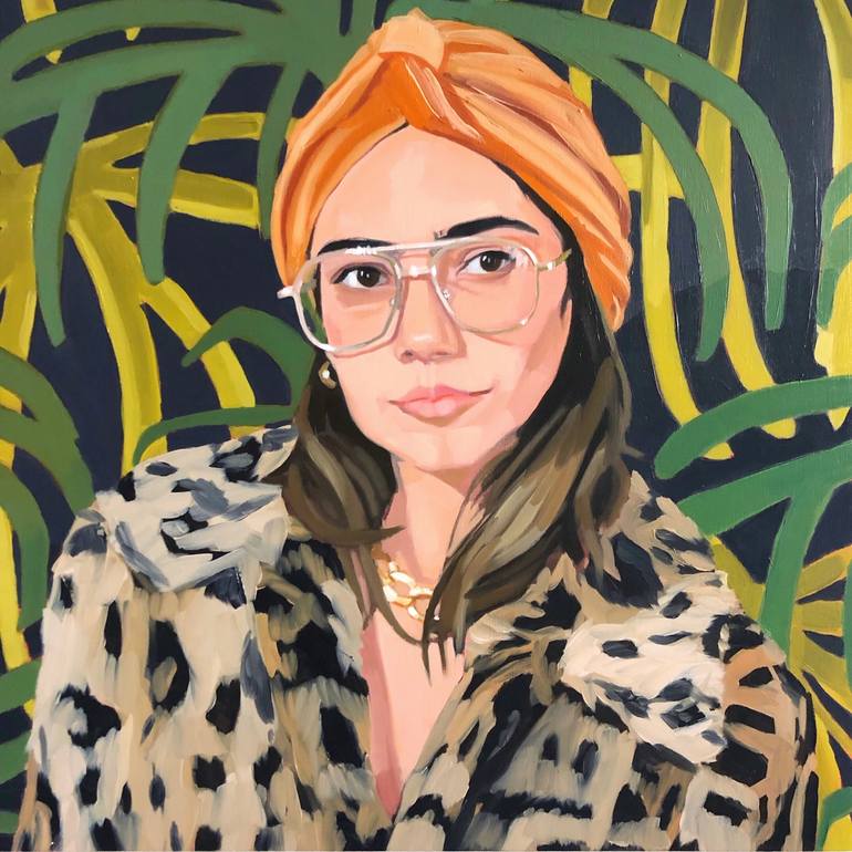 Almost all of my paintings are commissions, so this is one of maybe two personal works that I will create this year. My model wears my coat, a necklace and velvet turban that I purchased for the shoot and her own glasses. I spent 20 hours hand painting the wallpaper that she poses in front of just...