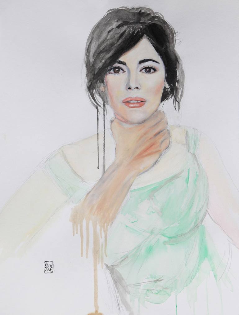 Nigella Lawson's portrait, being throttled by a body-less arm, her own body disappearing into airy watercolours. Body and hand painted in oil, hair in China ink, body in watercolor