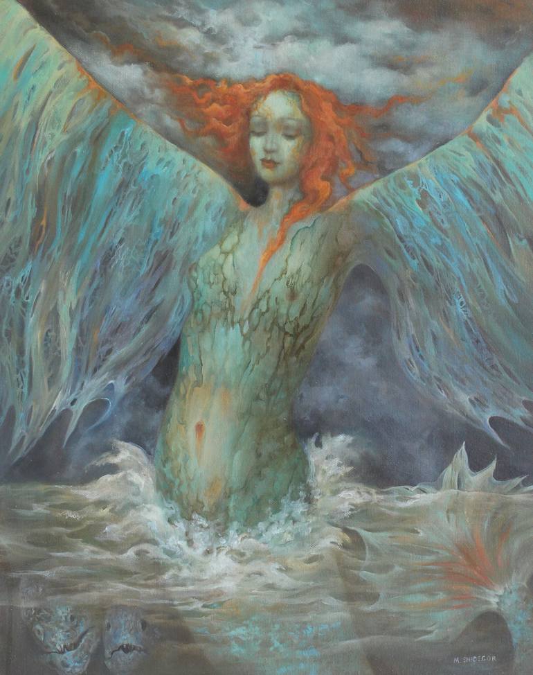An ethereal mermaid rises from the sea to take flight. This is an original oil on archival canvas board.