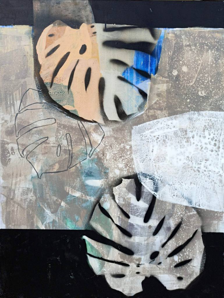 "Night and Day 3" is an elegant continuation of the series, featuring black sections at the top and bottom, with a gradient of grays in the middle. The central area is adorned with motifs of monstera leaves in white, black, and accents of beige. These organic shapes are seamlessly integrated into th...