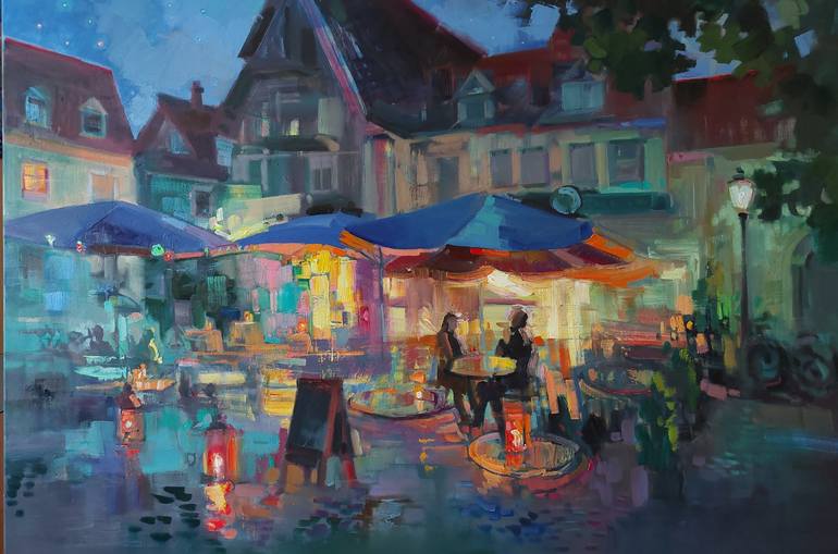 Night cafe in Durlach - southern Germany Warm evening in August Lantern light Cozy evening Impressionist painting Impasto oil paint layer