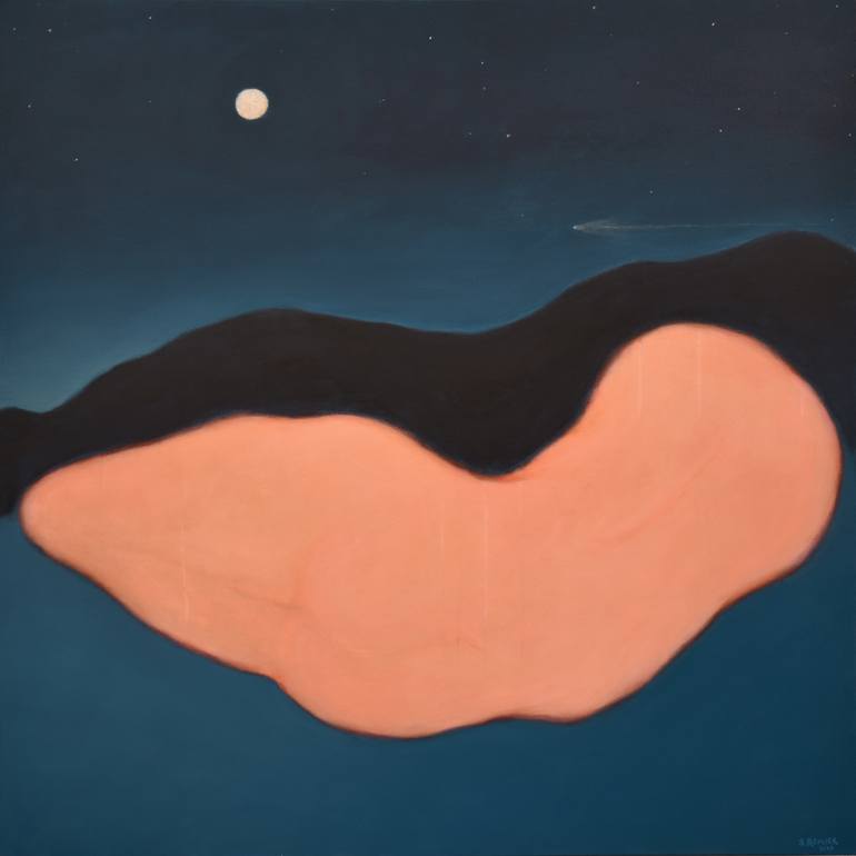 "Night". Inspired by a Rembrandt etching of a reclining nude and how silhouettes of mountains at night can look the same. Abstracted and stylized, feeling almost like a fragmented Greek sculpture. Painted in 2020. This is professional grade acrylic on canvas and measures 48" high by 48" wide. It is ...