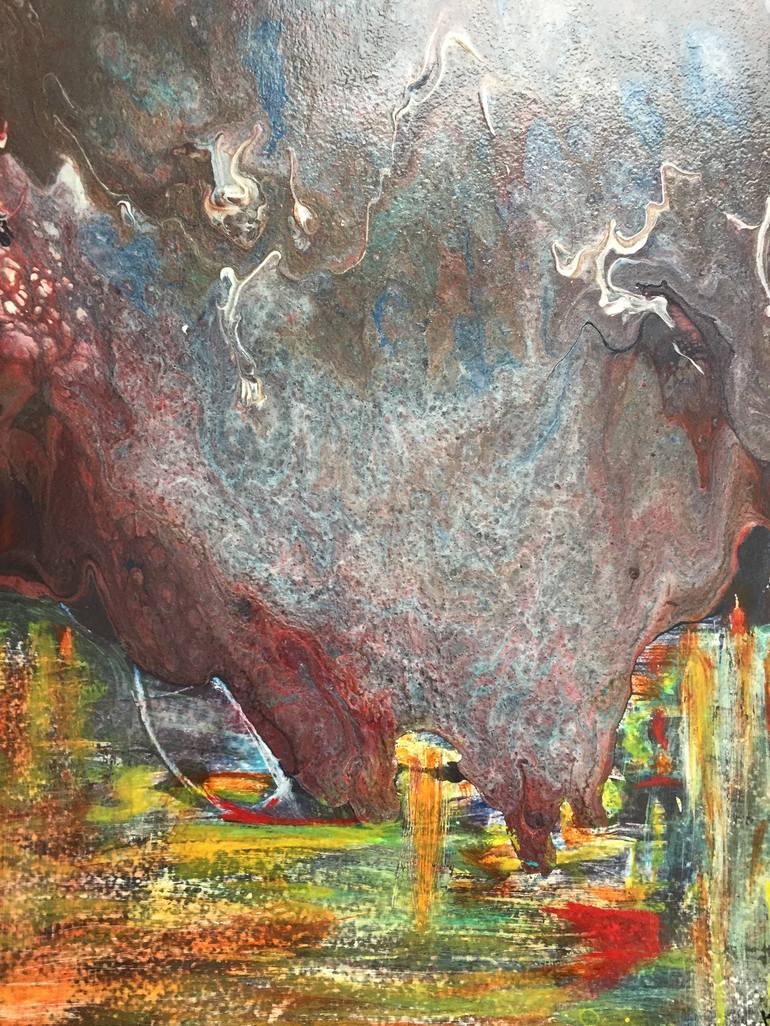 I've been experimenting with poured paints for fluid effects. On this one I decided to scrape the lower third off before resuming the pour, which left interesting color behind. I then scraped it and added high flow acrylics (similar to ink) for added color. It was a fun experiment. I have lightly di...