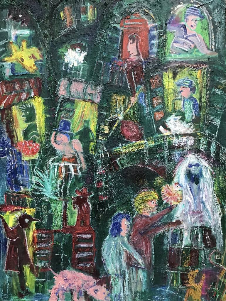 Inspired by the view out of my workshop's window of buildings, characters, situations including the naked neighbour, a manequen doll dressed up according to seasons, dogs, cats, plants and much daily and nightly city chaos...