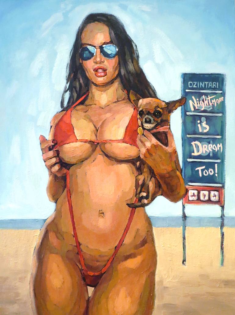 Nightmare is dream too. Bikini girl with doggy at Dzintary Beach in Jurmala, Latvia.