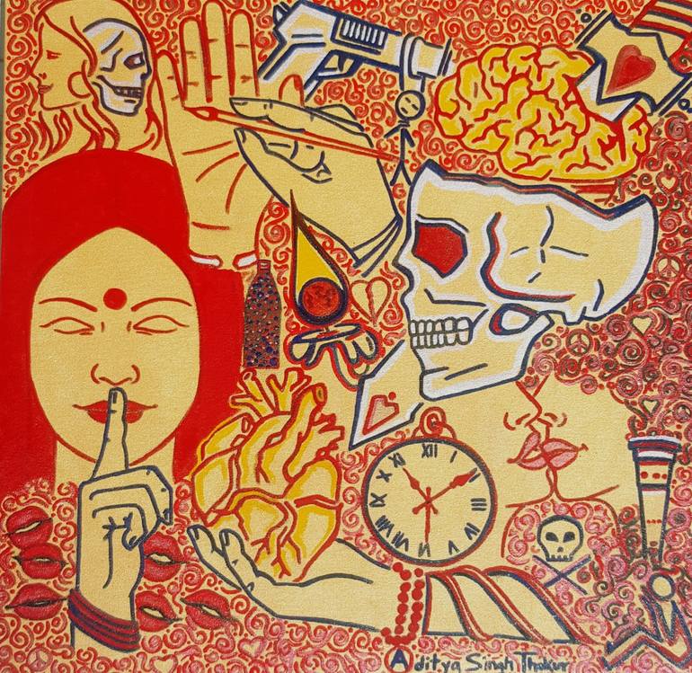 The artwork explores the intense emotional and psychological dualities of love and fear, using bold red and yellow hues to signify passion, turmoil, and secrecy. The composition features symbolic elements like a skull, a bleeding heart, a clock, and a shushing figure, all interwoven in a chaotic yet...