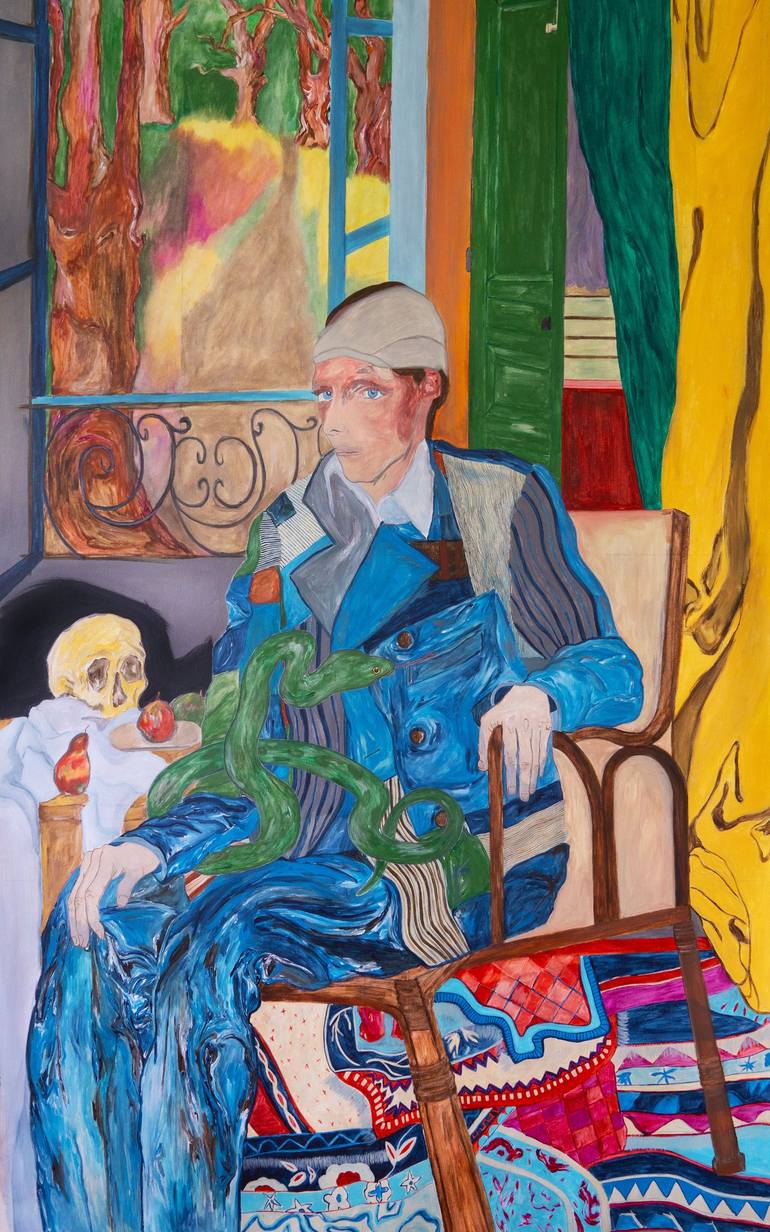From my series of portraits, this painting represents a man, seated on an armchair, in an interior as colorful as the exterior space to which it opens. The bandage around the model's head and the skin tones suggest a portrait of former Formula 1 driver Niki Lauda, now deceased, and scarred for lif...