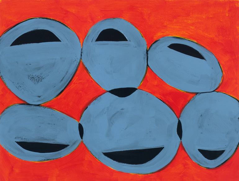 Small flashe painting on acid free watercolor paper from a series of improvisational works. Flashe is a matte water based vinyl paint which has the surface appearance of tempera. Inspired by the likes of Miro and Calder these simple abstract forms on white paper background echo the spirit of mid-ce...