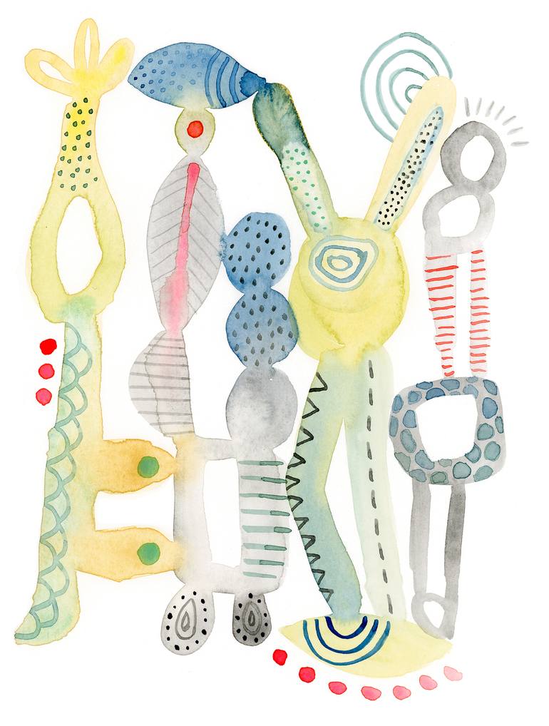 I painted the initial layer somewhat intuitively while also trying to include some anthropomorphic shapes. I love the way watercolor paint naturally bleeds and blooms colors into wet areas, so I encouraged these "accidents" to happen. Once the initial background dried I went back into the painting a...