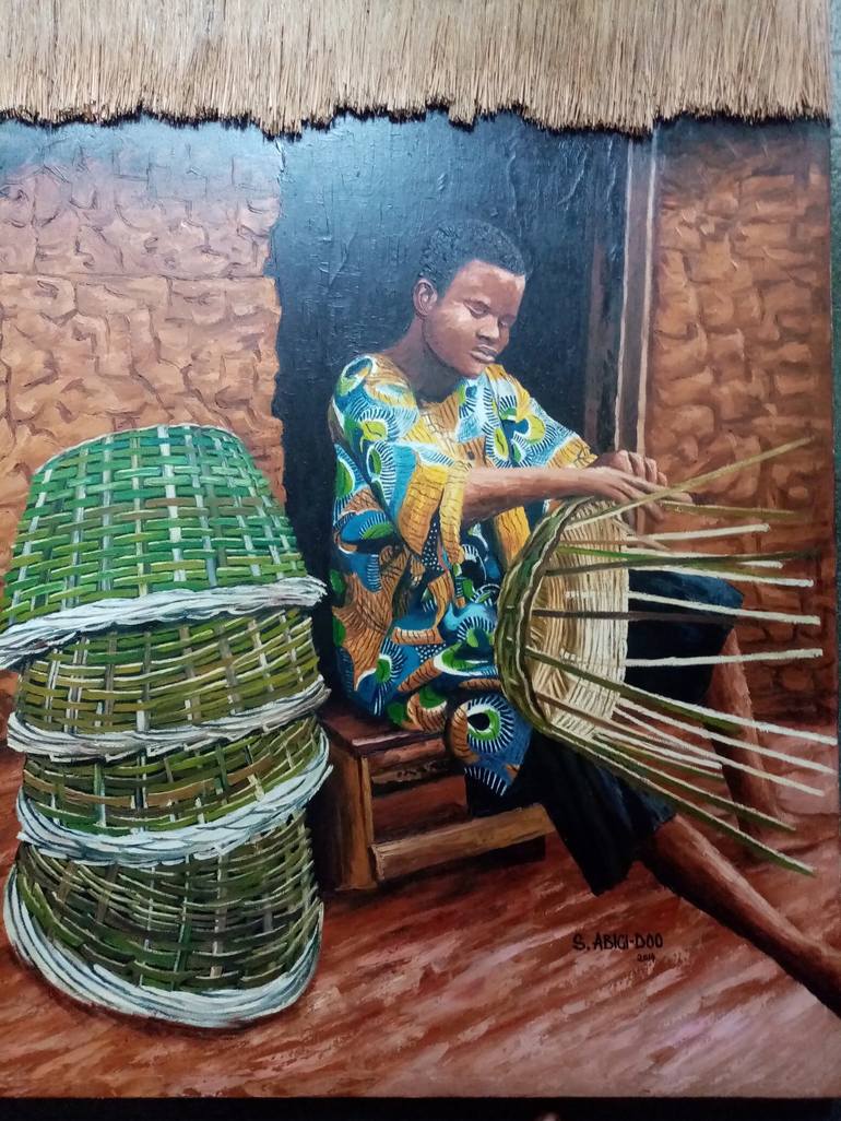 Basket weaving (also basketry or basket making) is the process of weaving or sewing pliable materials into three-dimensional artifacts, such as baskets, mats, mesh bags or even furniture. I learnt this when I was little. I put on this painting because of my pass life.