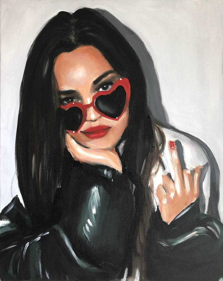 Maria Folger is a photorealist painter who lives in Los Angeles. She uses acrylic and oil paint to create portraits of women, playing on sexuality and femininity. Maria often depicts lingerie-clad beauties, vampy red lips, and patent heels but juxtaposes these subjects with pizza slices and pineapples, adding a humorous tone to some of her sensual works.
