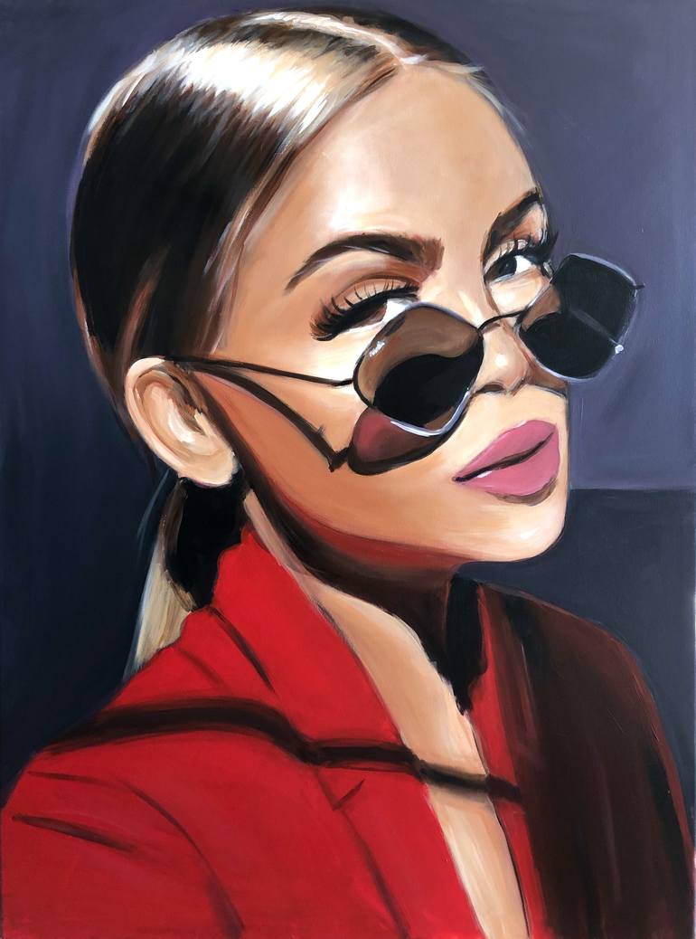 Maria Folger is a photorealist painter who lives in Los Angeles. She uses acrylic and oil paint to create portraits of women, playing on sexuality and femininity. Maria often depicts lingerie-clad beauties, vampy red lips, and patent heels but juxtaposes these subjects with pizza slices and pineapples, adding a humorous tone to some of her sensual works.