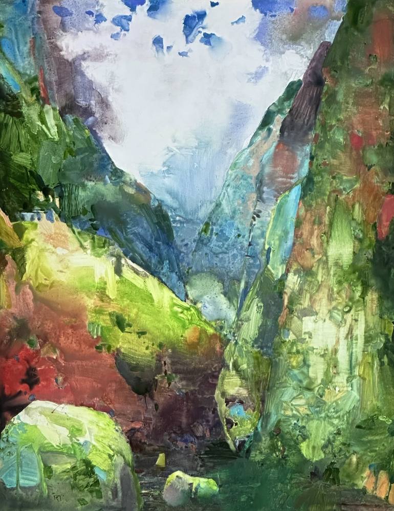 This is an improvisation in watercolor on the plastic paper from Japan called Yupo. I use it because its brilliant white surface reflects light back through the paint layer. The subject is constructed by way of memory. I have spent a lot of time hiking and studying in the Columbia River Gorge.