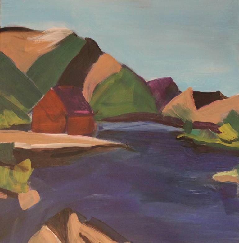 Acrylic on Canvas Red house at a lake 40 cm x 40 cm x 1 cm