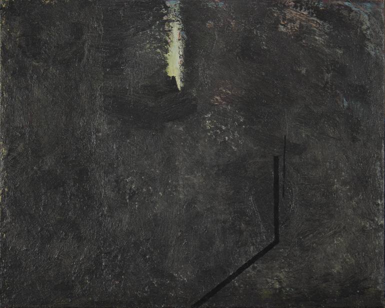 Complex build up of layers of paint with minimal space definers moving, swaying almost in void of metallic graphite. Oil on linen on 3/4" birch panel. Framed with white painted liner and white painted/stressed oak frame.
