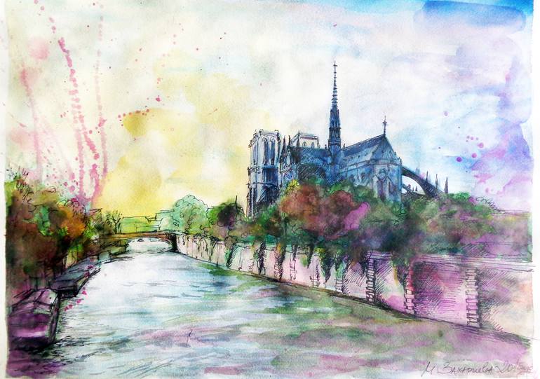 "Notre-Dame Cathedral" is a beautiful watercolor and ink painting on paper. The artist skillfully captured the iconic cathedral with delicate washes of color and precise pigment liner details. This fine art piece evokes the beauty of the Notre-Dame Cathedral in Paris, France. The artwork is reminis...