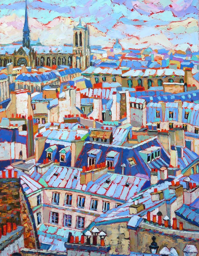 This is the unique painting from my series of Paris Rooftops. The edge of the work is white and it's ready to hang. It's one of my recent work and was inspired after devastation fire in cathedral Notre-Dame de Paris.