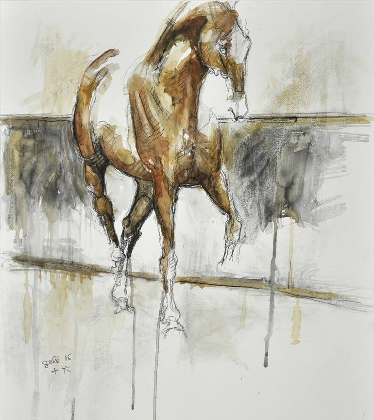 Painting of a dressage horse in "passage" ::: Medium: watercolor and black chalk on paper (without frame), finished with a varnish, sent rolled in a tube. Painting done on stretcher but I remove it for the sending. ::: Size: 27.5 x 24.4 in / 70 x 62 cm ::: Year: 2016