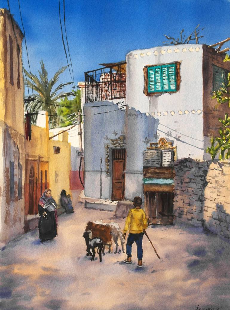 Original watercolor painting of a Nubian village on Elephantine Island, Aswan, Egypt. Painted in a warm, realistic style, it captures the simple charm of Nubian architecture with earthy textures and rooftops against the Nile’s serene backdrop. Elephantine Island — rich in history and culture — adds ...