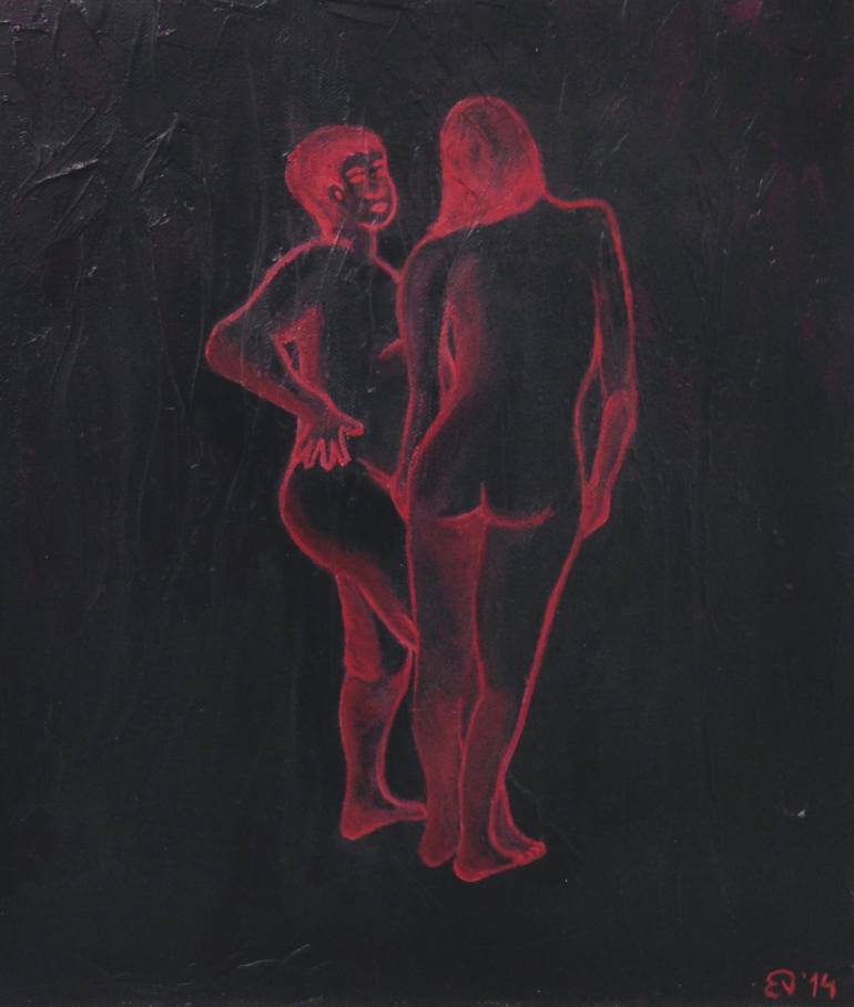 A nude couple looking each other before initiating an erotic activity.
