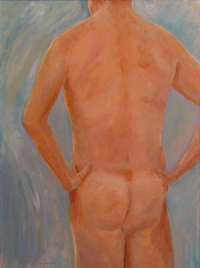 This contemporary figurative painting captures the rear view of a nude male torso bathed in a soft light. The artist masterfully uses oil on canvas to portray the subject with sensitivity and grace. Small dashes of color create subtle movement and visual interest, while the primary colors of pink an...