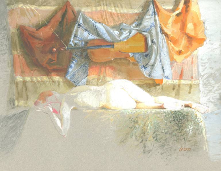 In this painting watercolor and gouache blends the beauty of music and the human form. The artwork features a nude figure with a cello, adding a touch of elegance and sophistication. The background is adorned with various cloth materials of different colors and patterns, enhancing the depth and com...