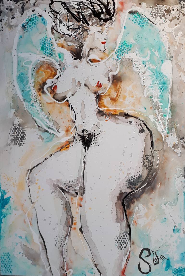 Inspiration for this painting is the female body and is presented as nude angel with wings....
