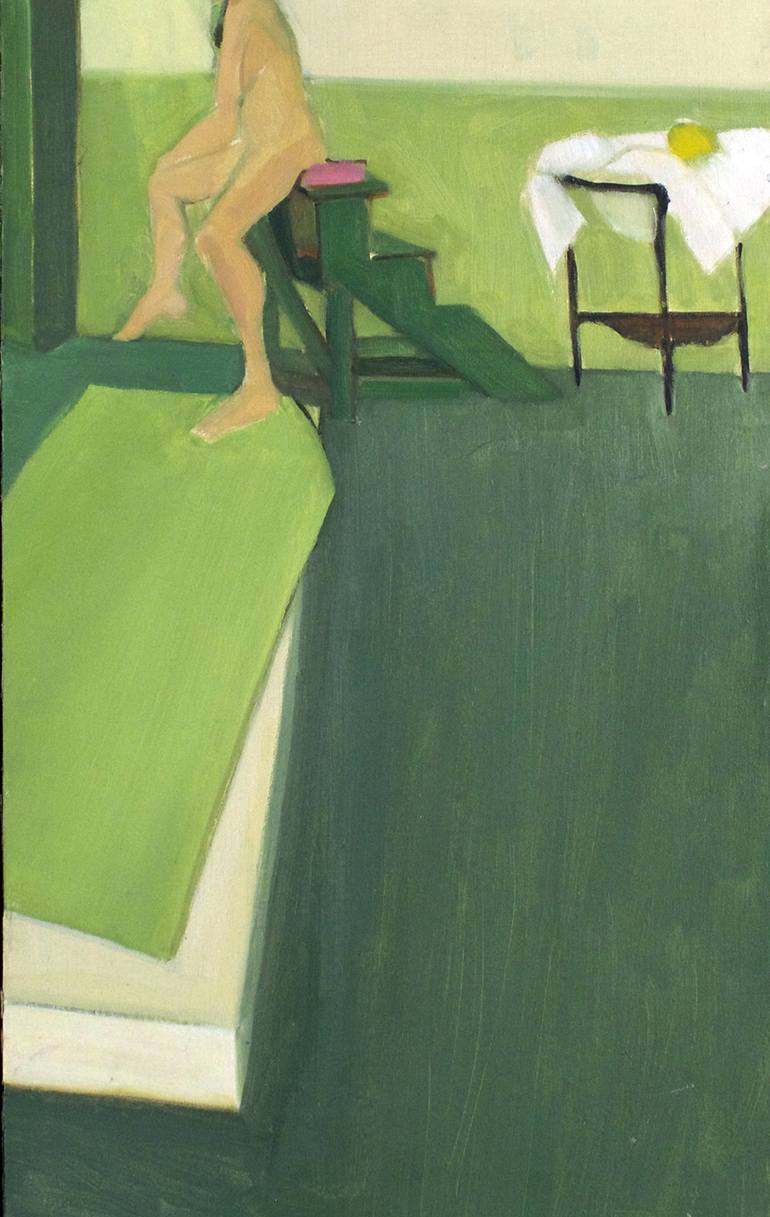 Painted in a studio. The perspective has been eliminated and creates flat graphic shapes. The model is shown on a ladder with a table and still life. Size doesn’t include frame.