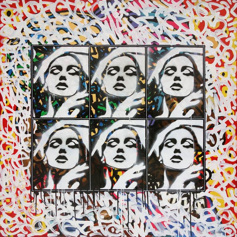 This painting is inspired by street art. Executed using stencil, spray paint, markers and acrylic paint. Kept in street art - pop art style. The characteristic motif of the woman's face has been often used by the artist in many of his artworks including murals, canvases and other graphics. Artwork ...