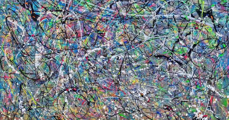 “Number 90” is a captivating work of art inspired by Jackson Pollock’s abstract expressionism, overflowing with energy and intensity through its iconic dripping technique. This impressive large-format canvas (200x100 cm) stands out with its vibrant gradient background, blending ocean blue, neon yell...