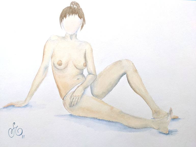 Young girl is siting on the floor. The picture is executed on a white background in flesh colors.